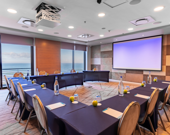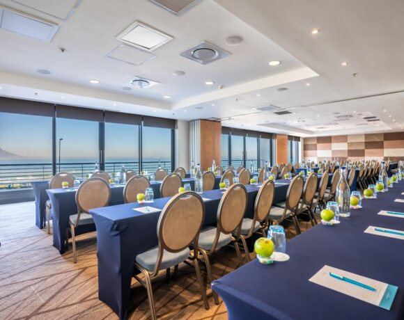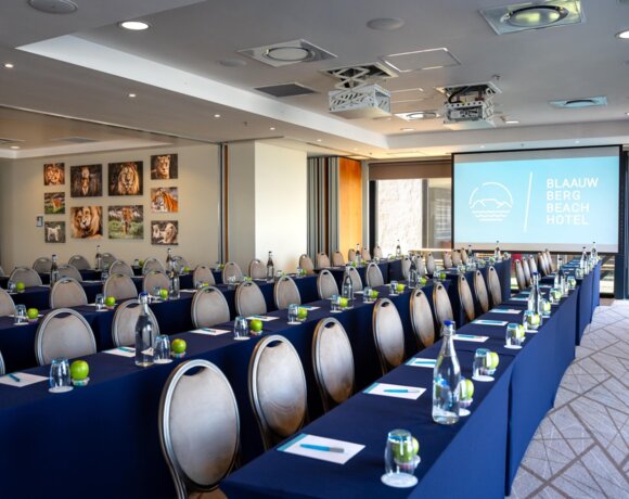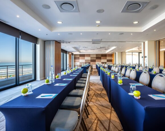 The Tides Room can seat a maximum of 105 delegates in cinema-style seating. The venue can be divided into 2 venues (Hightide and Lowtide). Hightide can seat a maximum of 45 delegates in cinema- style seating and Lowtide a maximum of 60 delegates in cinema-style seating while experiencing the beauty of the Atlantic Ocean, the iconic Table Mountain, and the historical significance of Robben Island.