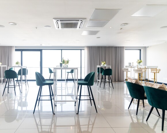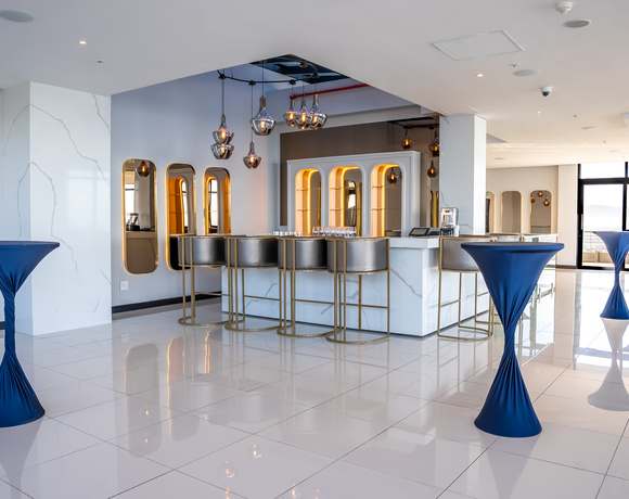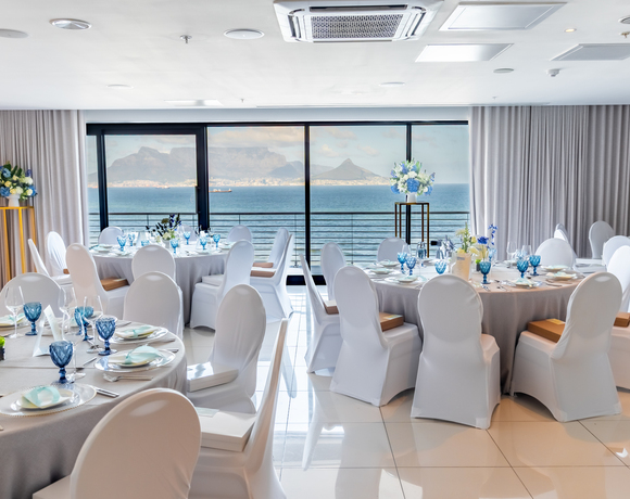 Sand & Sea, our rooftop venue with its wrap around veranda is located on the hotel's 12th & 13th floors. This venue features a sleek, contemporary style and uninterrupted views of the Atlantic Ocean, Table Mountain, and Robben Island. This is the perfect venue for not only a corporate function but is an ideal showstopper for a special celebration. Seating 100 people for a banquet, 150 for a cocktail party or 100 schoolroom seating. This venue can provide a truly unforgettable view as you watch the sunset from high above.